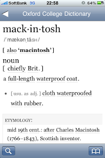 左上は macintosh で引いた結果から、別スペルとして紹介された Mackintosh をタップした画面。下線付きはリンク可能となってるようです。また同一単語で noun、adjective など複数ある場合にタップしてジャンプすることが出来ます。